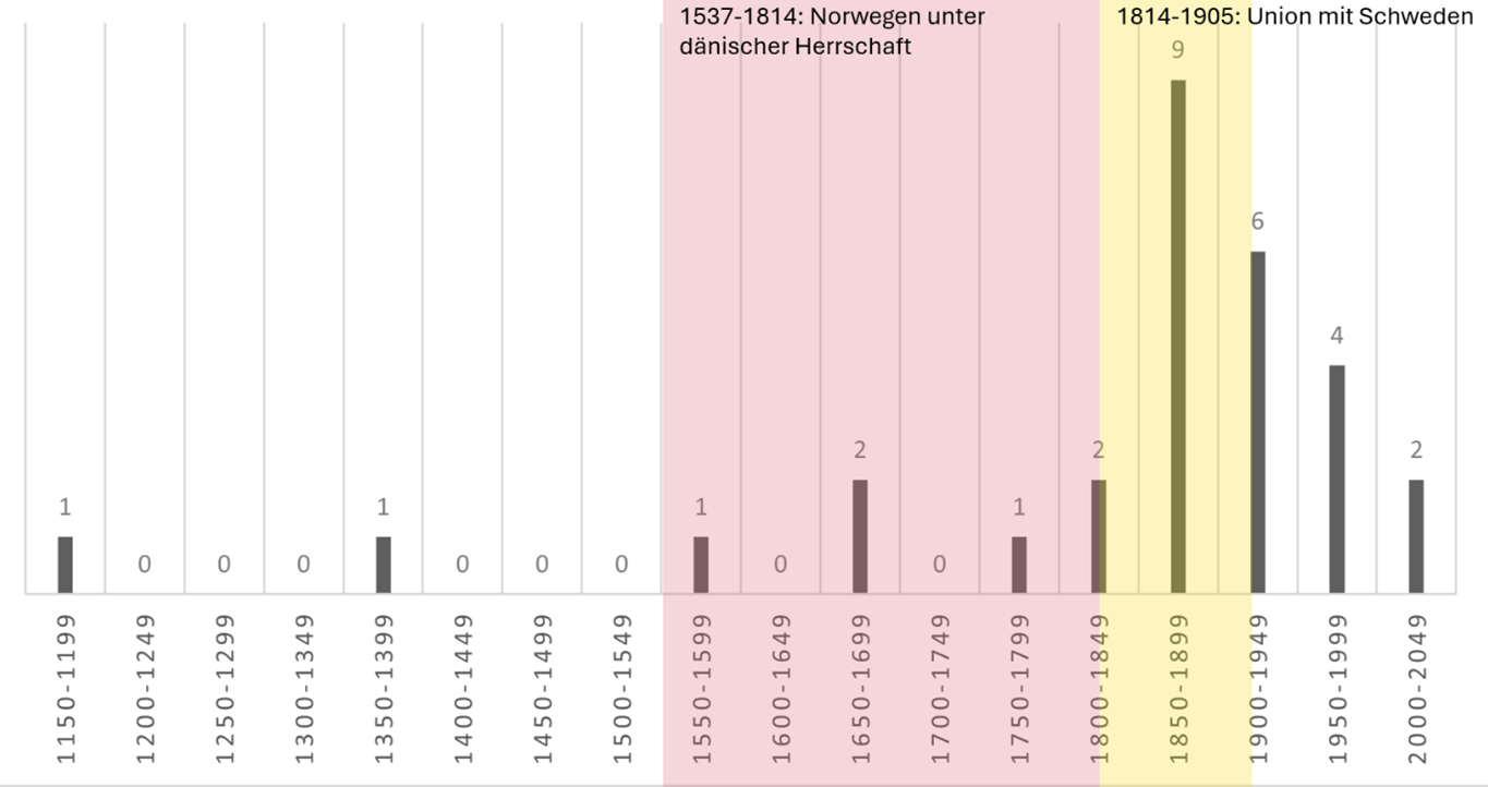 Darüber hinaus hing Norwegen mit der Medienproduktion lange hinterher: Die erste Druckerei wurde erst 1643 eröffnet, und 1815 gab es in Norwegen nur acht Druckereien.1 Auch eine bürgerliche Öffentlichkeit entwickelte sich in Norwegen erst im 19. Jahrhundert. Zwischen 1840 und 1883 stieg die Anzahl der Druckereien in Norwegen von 28 auf 110, und 1884 begann die de facto Nationalbibliothek auch Tageszeitungen und kleine Drucke (Flugblätter, Aushänge) zu sammeln.2 Allerdings stieg die Medienproduktion und der Sammlungsumfang im 20. Jahrhundert noch deutlich stärker – zwischen 1940 und 1980 hatte sich die Informationsmenge in Norwegen ca. alle zehn Jahre verdoppelt.3 Dieser Medienboom spiegelt sich jedoch nicht in der Anzahl ausgestellter Werke wider. Stattdessen liegt ein großer zeitlicher Fokus auf der zweiten Hälfte des 19. Jahrhunderts und somit der Nationalromantik.