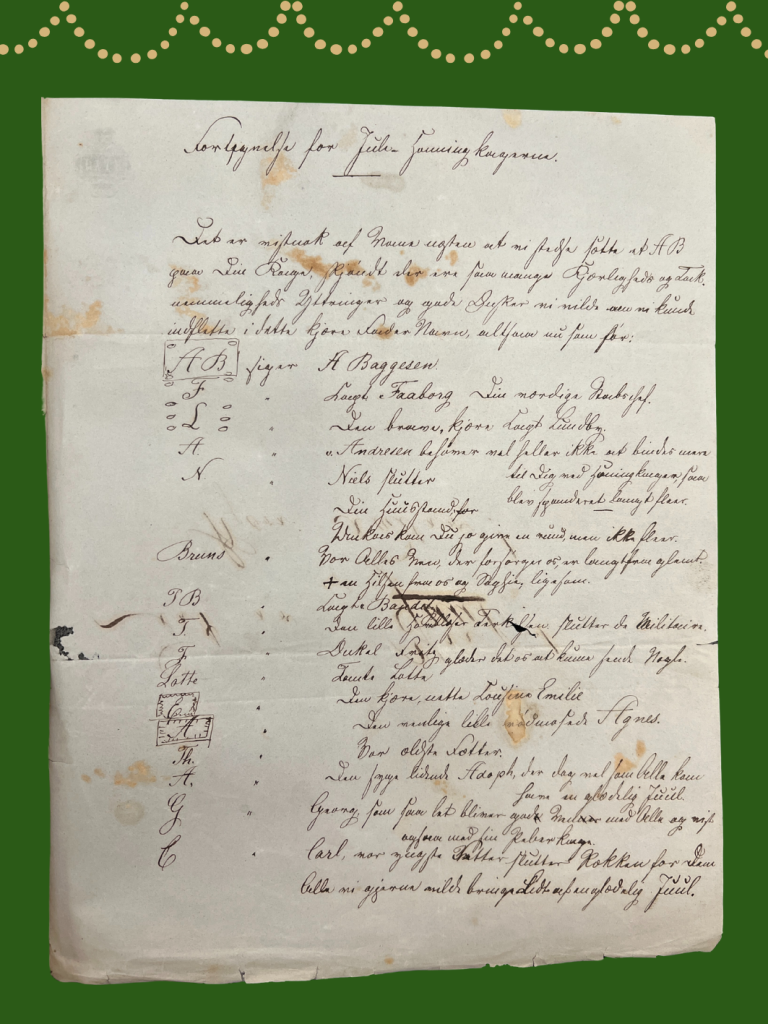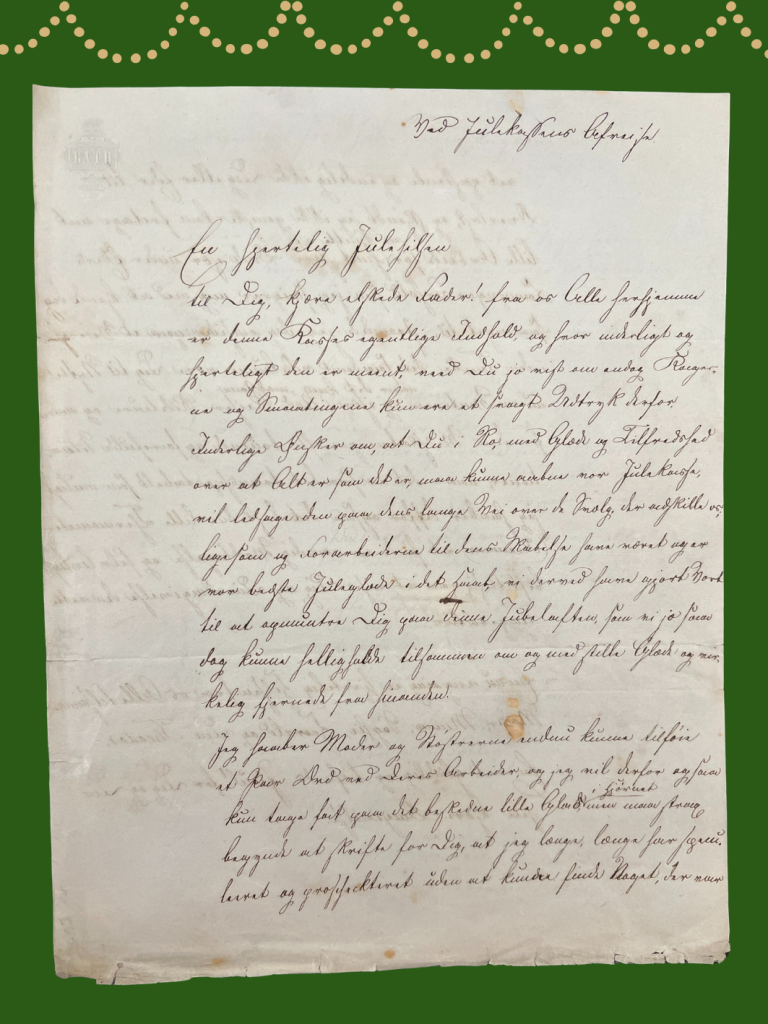 Passend zu unserer vorweihnachtlichen Stimmung stießen wir auf ein Schreiben von Theodor Baggesen, einem Enkel Jens Baggesens, das vermutlich am 22. Dezember 1850 entstand und als Beilage zu einem „julekasse“ gedacht war – einem Weihnachtspäckchen, das unter anderem Lebkuchen für seinen Vater August Baggesen enthielt.